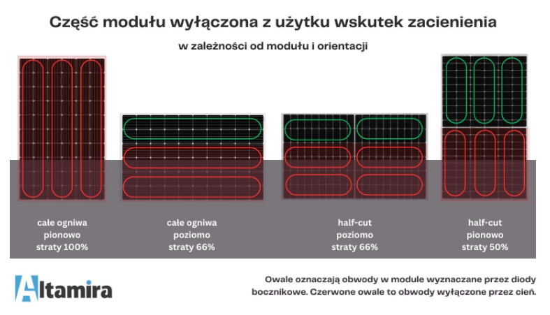 Zależność między typem i orientacją modułów a stratami przy zacienieniu opisuje poniższa grafika.