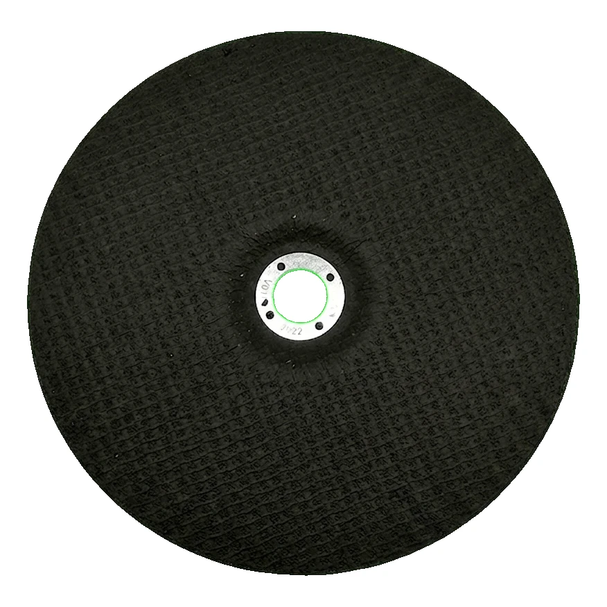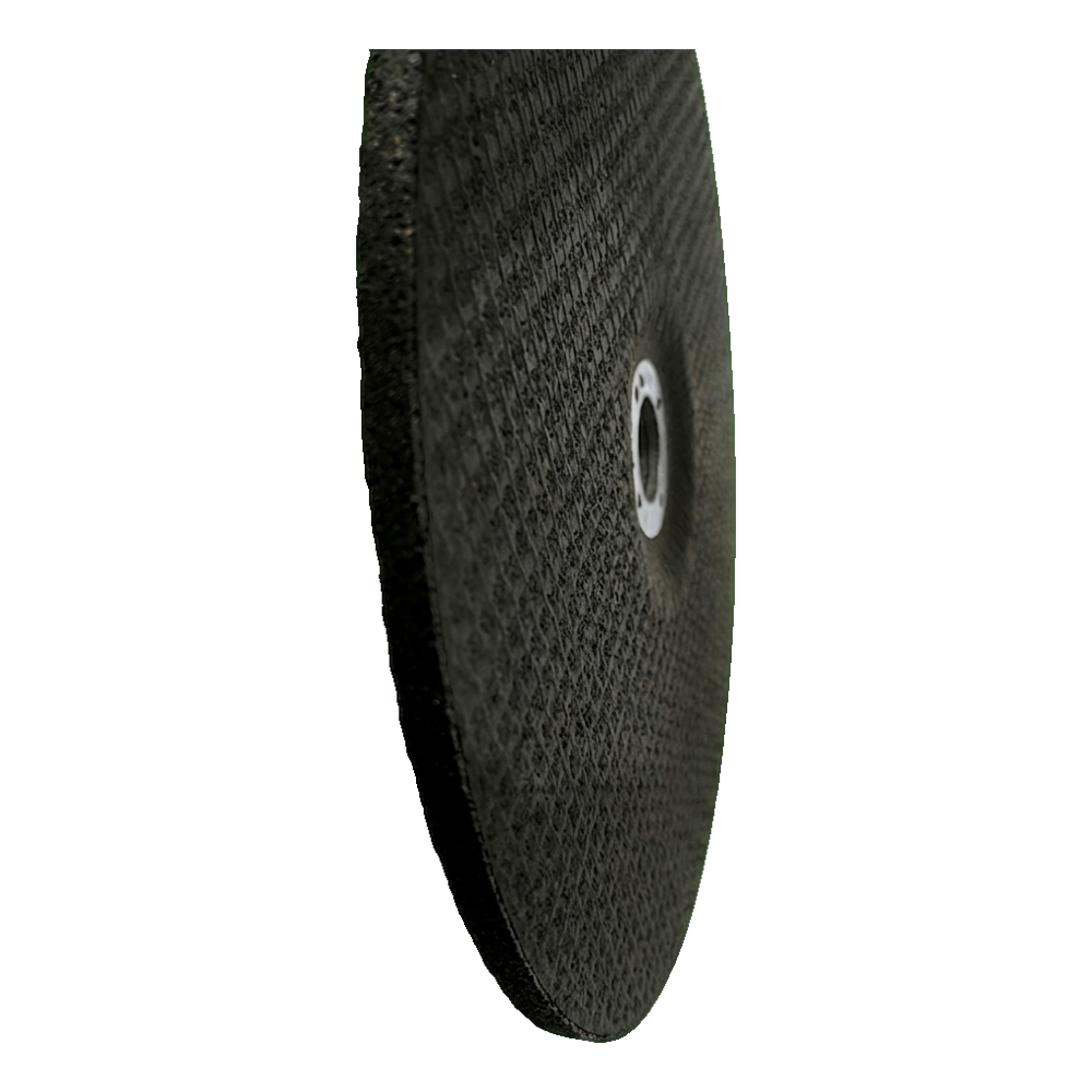 Tarcza posiada wklęsły profil centralny (typ 27), dzięki czemu powierzchnia robocza nie koliduje z nakrętką mocującą szlifierki. Widoczna od strony tylnej siatka zbrojeniowa z włókna szklanego wzmacnia strukturę ściernicową i zabezpiecza przed rozpadem tarczy przy obrotach roboczych.