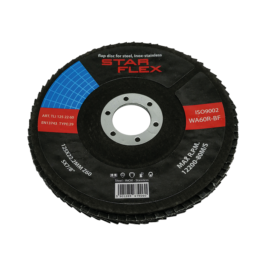 Tarcza listkowa odgięta Star Flex T29 o średnicy 125 mm z ziarnem cyrkonowym i granulacją 60 — narzędzie zaprojektowane do intensywnego szlifowania stali nierdzewnej (INOX) oraz stali węglowej. Pokrycie cyrkonowe zapewnia właściwości samoostrzenia, dzięki czemu tarcza zachowuje wysoką wydajność przez cały okres eksploatacji, co przekłada się na mniejsze zużycie materiałów i niższe koszty realizacji zleceń.