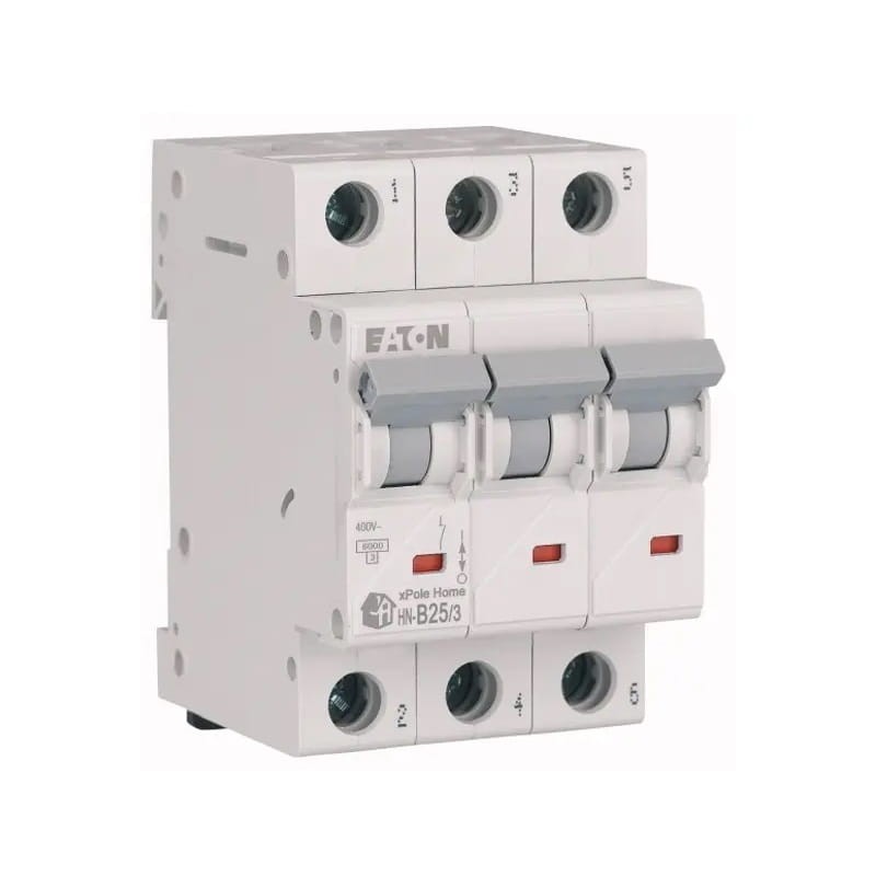 Wyłącznik nadprądowy B 25A 3P 6kA HN-B25/3 xPole Home 194883 marki EATON chroni instalację elektryczną przed przeciążeniem i zwarciem.